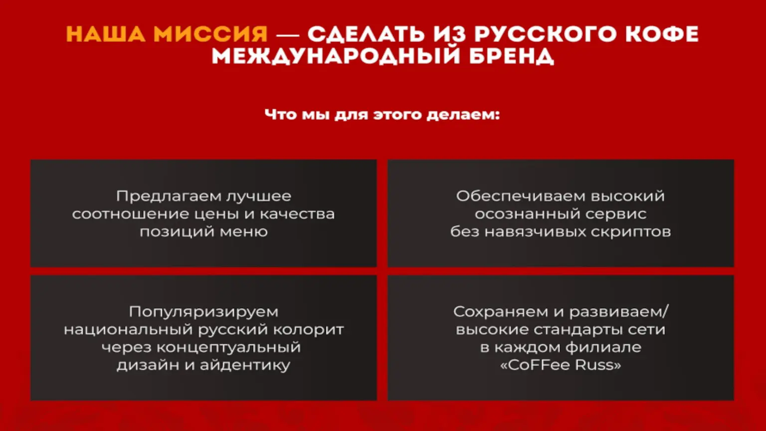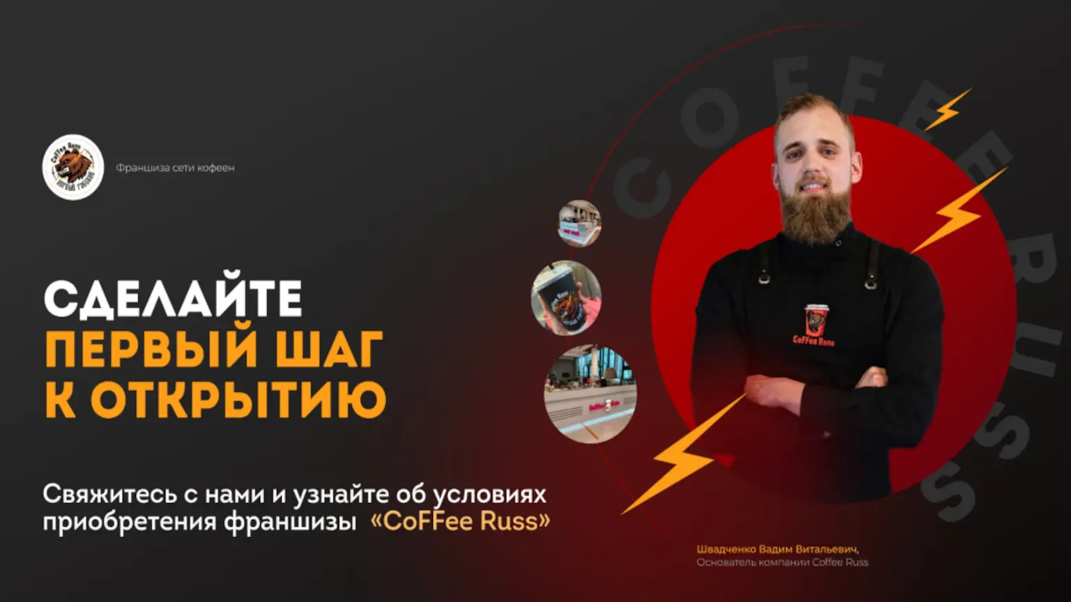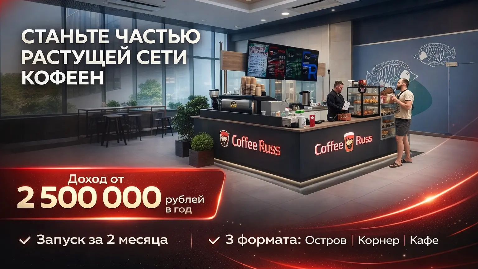 Coffee RussСтоимость360 000 ₽Инвестиции1 500 000 ₽Окупаемость9 мес.Доход200 000 ₽Это не ещё одна кофейня, чьё название невозможно запомнить. Мы — сеть Коферусс с национальным характером и яркой идентичностью. Наши партнеры добиваются окупаемости за срок 6-10 месяцев. Мы всему вас обучим, поможем с подбором помещения, открытием кофейни, наймом сотрудников и будем рядом на каждом этапе. Наши партнёры уже управляют успешными точками по всей Москве. Мы знаем, как не потеряться на карте города, и верим, что у кофе — большое русское будущее. Присоединяйтесь к нашей истории!