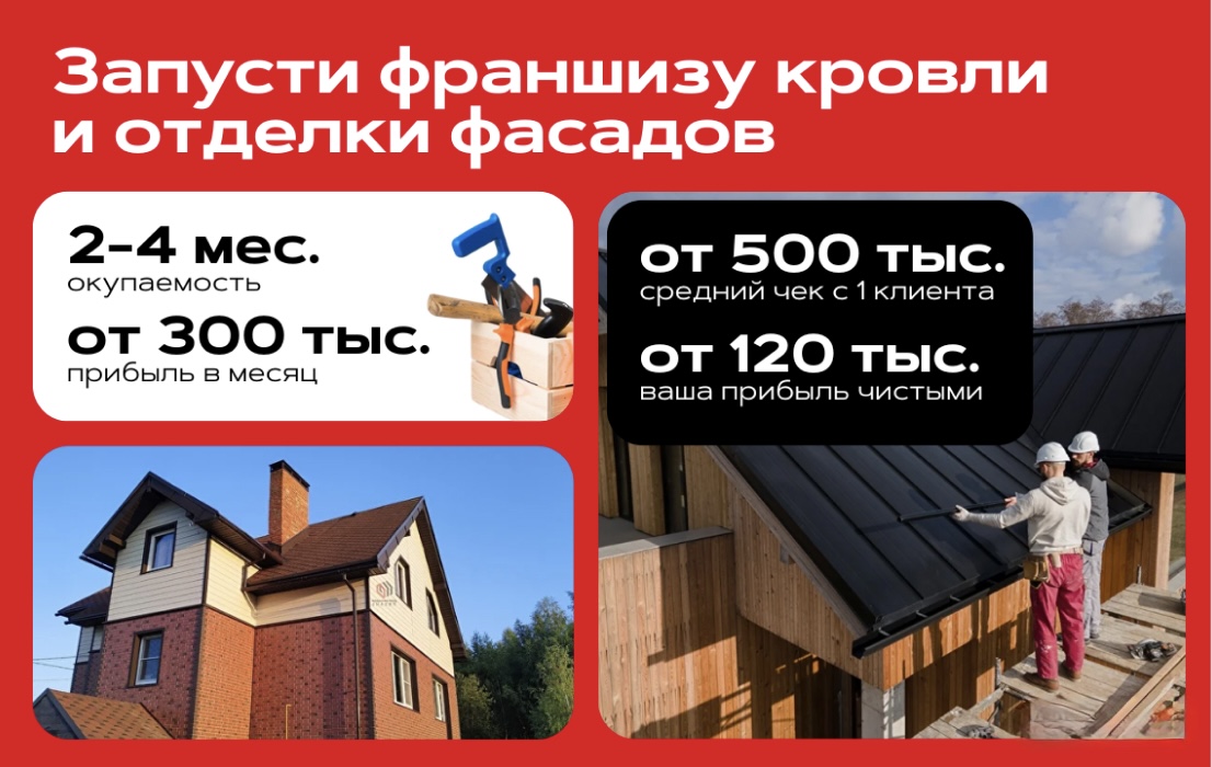 Дом фасадовСтоимость630 000 ₽Инвестиции50 000 ₽Окупаемость3 мес.Доход450 000 ₽Дом фасадов — быстрорастущая франшиза по кровлям и фасадам «под ключ». Компания работает с 2016 года, по франшизе с 2021 года уже открыто более 85 успешных филиалов по всей России. Опыт в строительстве не нужен — обучаем с нуля. Без офиса и вложений в материалы. Окупаемость — от 3 месяцев, средний доход — от 450 000 рублей в месяц. Оставьте заявку и инвестируйте в проверенную модель, а не в гипотезу.