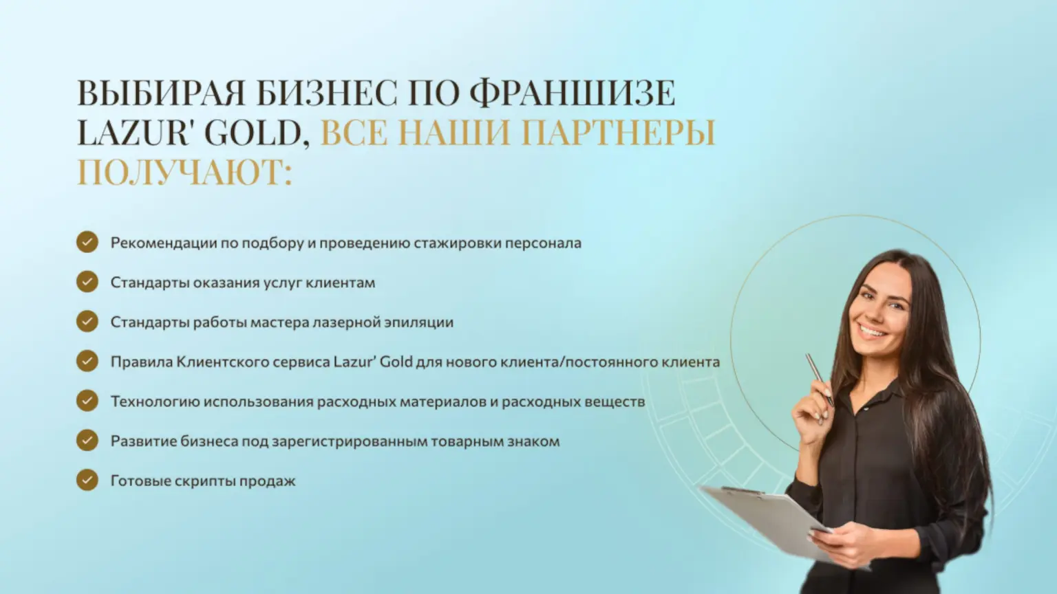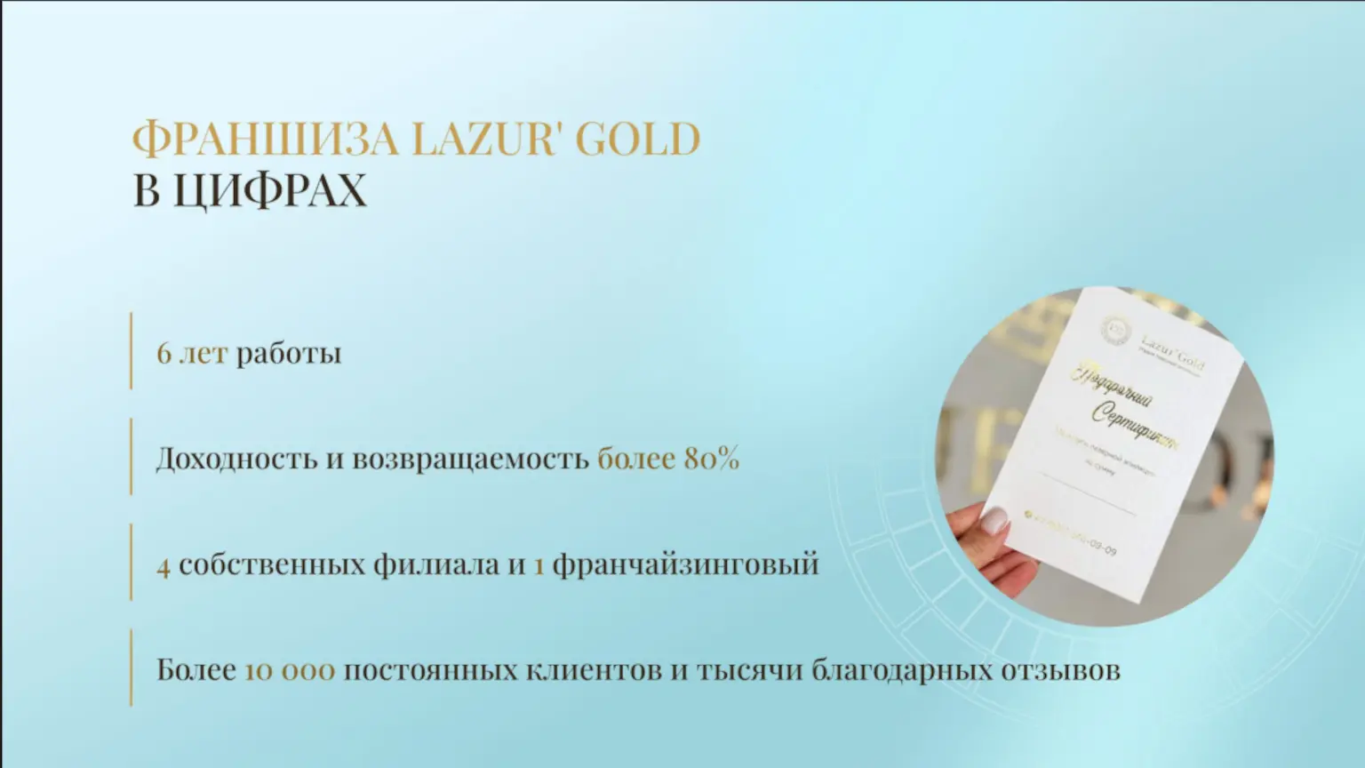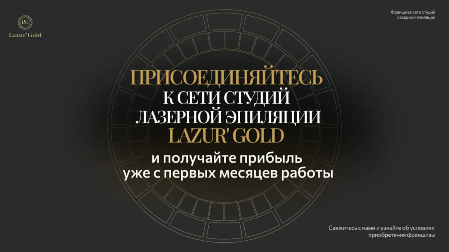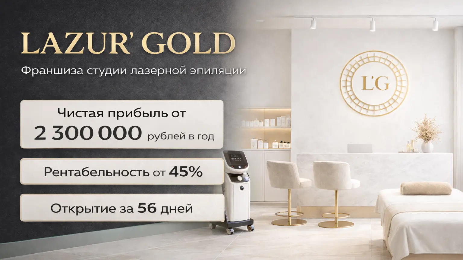 Lazur' GoldСтоимость360 000 ₽Инвестиции630 000 ₽Окупаемость11 мес.Доход170 000 ₽Lazur' Gold — это франшиза студии лазерной эпиляции. Мы предлагаем решение для женщин, ведущих активный образ жизни и ценящих комфорт. Преимущества партнера: Высокий спрос у ЦА 20-35 лет Современное лазерное оборудование Обучение и маркетинговая поддержка Высокомаржинальные услуги Получите готовую бизнес-модель: обучение, технологии, бренд-бук. Откройте прибыльную студию в перспективной нише красоты. Откройте Lazur' Gold в вашем городе!