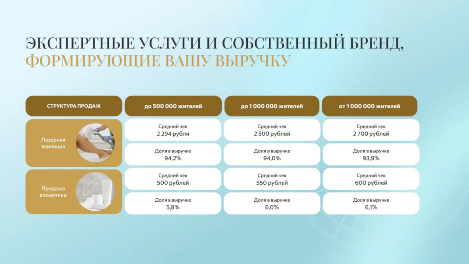 Dr.LaserСтоимость800 000 ₽Инвестиции1 900 000 ₽Окупаемость18 мес.Доход320 000 ₽Федеральная сеть студий лазерной косметологии Dr.Laser, основана в 2019 году и насчитывает более 60 полноформатных студий. Сеть стабильно показывает высокие финансовые результаты — среднемесячная выручка 796 000 рублей. Работа ведётся по медицинской лицензии и на сертифицированном оборудовании с регистрационным удостоверением. Сеть активно внедряет новейшие косметологические услуги, расширяя источники дохода партнёров и создавая дополнительный потенциал роста и масштабирования бизнеса.