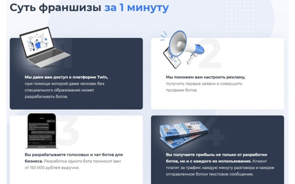 TwinСтоимость450 000 ₽Инвестиции90 000 ₽Окупаемость5 мес.Доход300 000 ₽IT-франшиза нового поколения с доходностью от 300 000 рублей позволит вам зарабатывать на разработке голосовых и чат-ботов для бизнеса, а также получать доход с каждого использования бота. Франшиза позволяет открыть бизнес даже людям, не имеющим опыта в IT-сфере. Рентабельность бизнеса достигает более 22,7% по чистой прибыли.