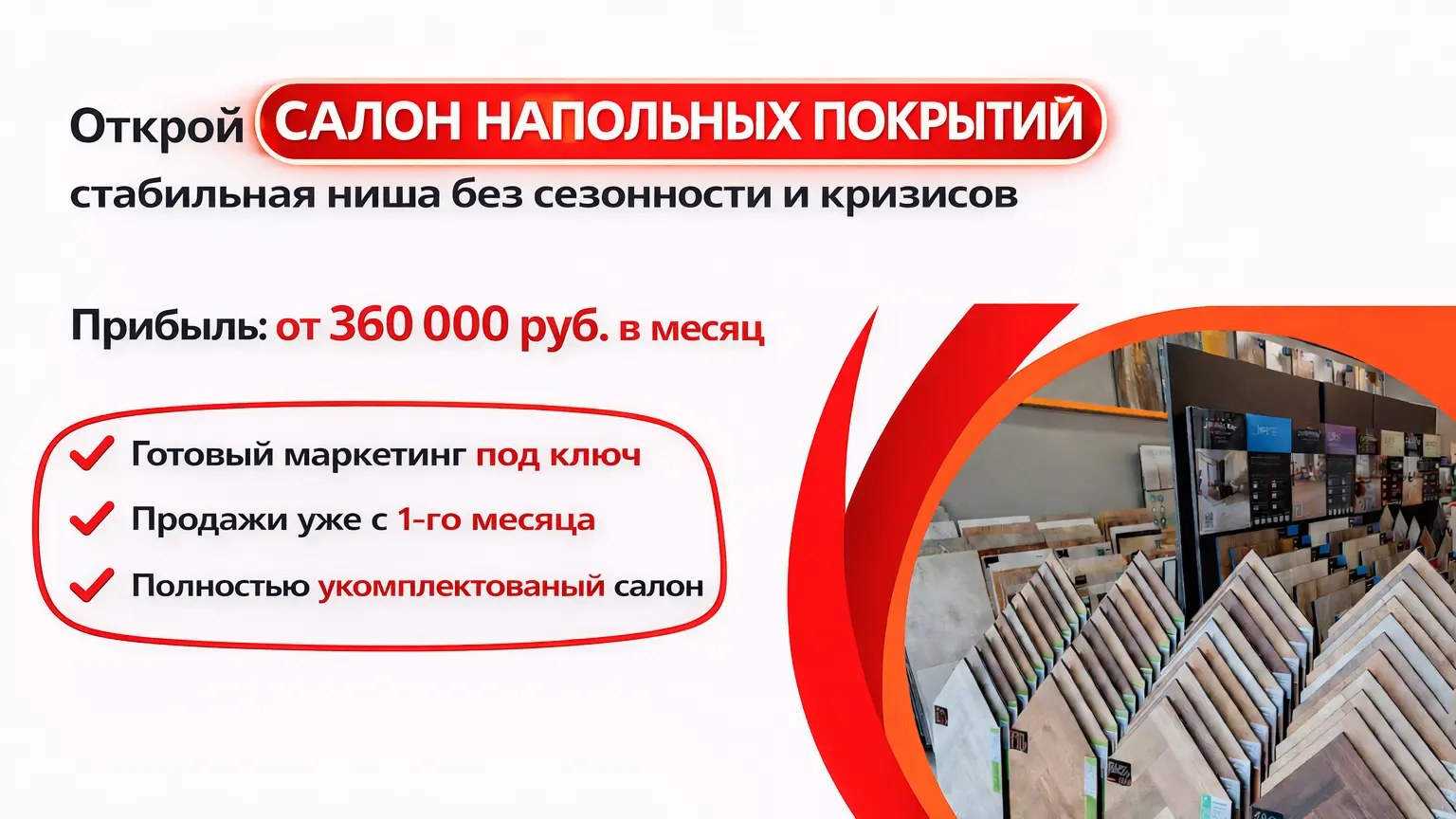 Салон напольных покрытийСтоимость590 000 ₽Инвестиции1 300 000 ₽Окупаемость6 мес.Доход360 000 ₽Франшиза салона напольных покрытий и дверей с быстрым стартом и вложениями под ключ от 1,2 млн. рублей. Мы обеспечиваем подготовку к открытию, маркетинговую поддержку и полное сопровождение бизнеса. Франчайзи получают прямые цены от производителей, персонального менеджера, обучение, поддержку 24/7 и пошаговый план запуска с учётом города. Рынок полов и дверей стабилен и востребован. Более 2-х лет успешно развиваем партнёрскую сеть. Предложение действует для городов с населением от 100 000 человек.