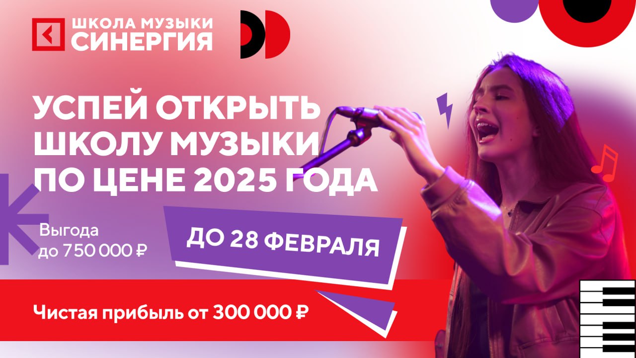 Школа музыки «Синергия»Стоимость750 000 ₽Инвестиции850 000 ₽Окупаемость8 мес.Доход300 000 ₽Наша академия является уникальным детским проектом холдинга СИНЕРГИЯ. Мы обеспечим вас первыми 20 учениками до открытия, передадим оцифрованные бизнес-процессы и простую схему управления, доступную даже новичкам в бизнесе. Мы гарантируем вам прибыль с первого месяца и рентабельность 43–60%. А благодаря команде маркетологов и поддержке на всех этапах запуска, мы сделаем запуск вашего бизнеса максимально лёгким и комфортным.