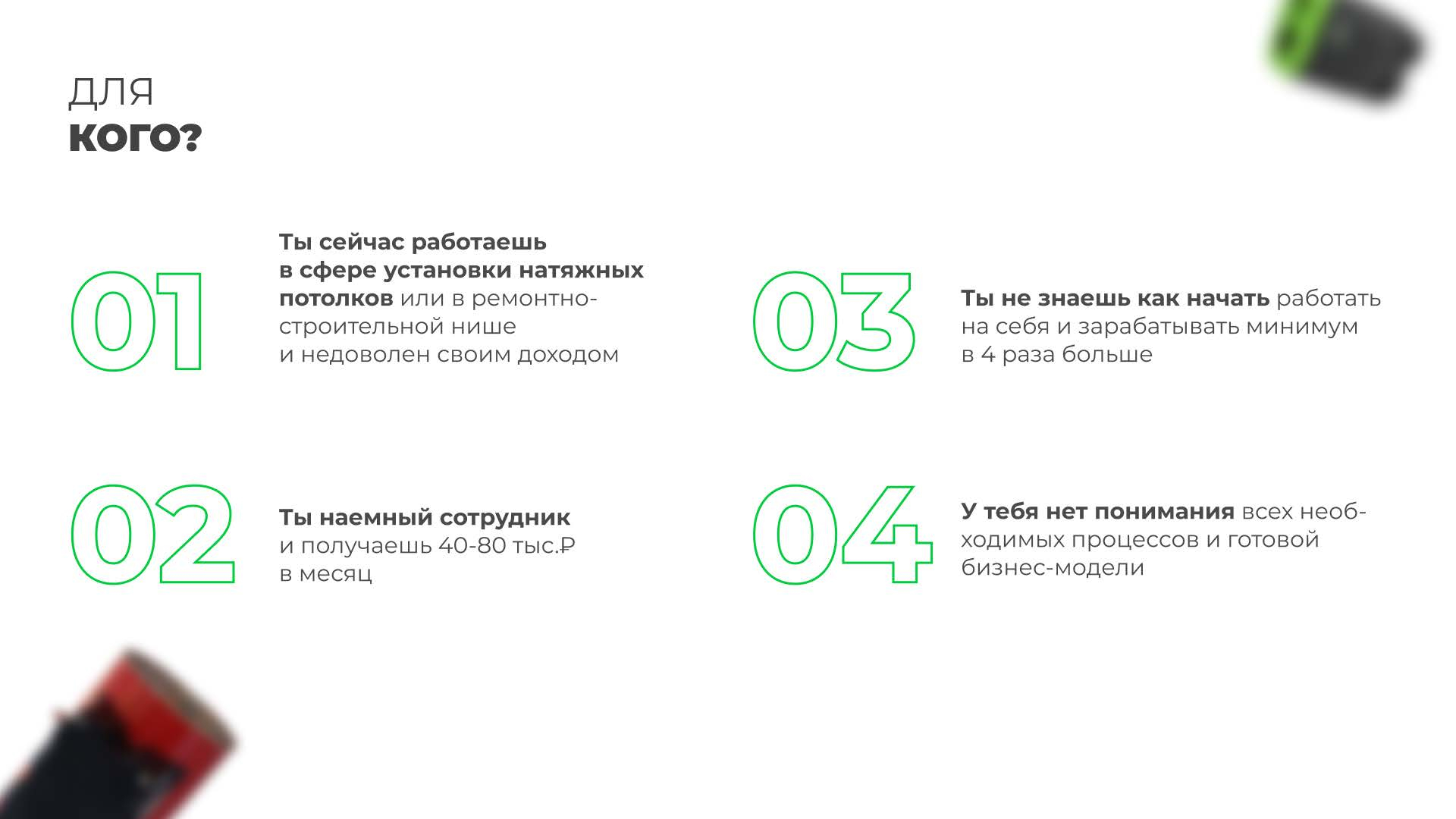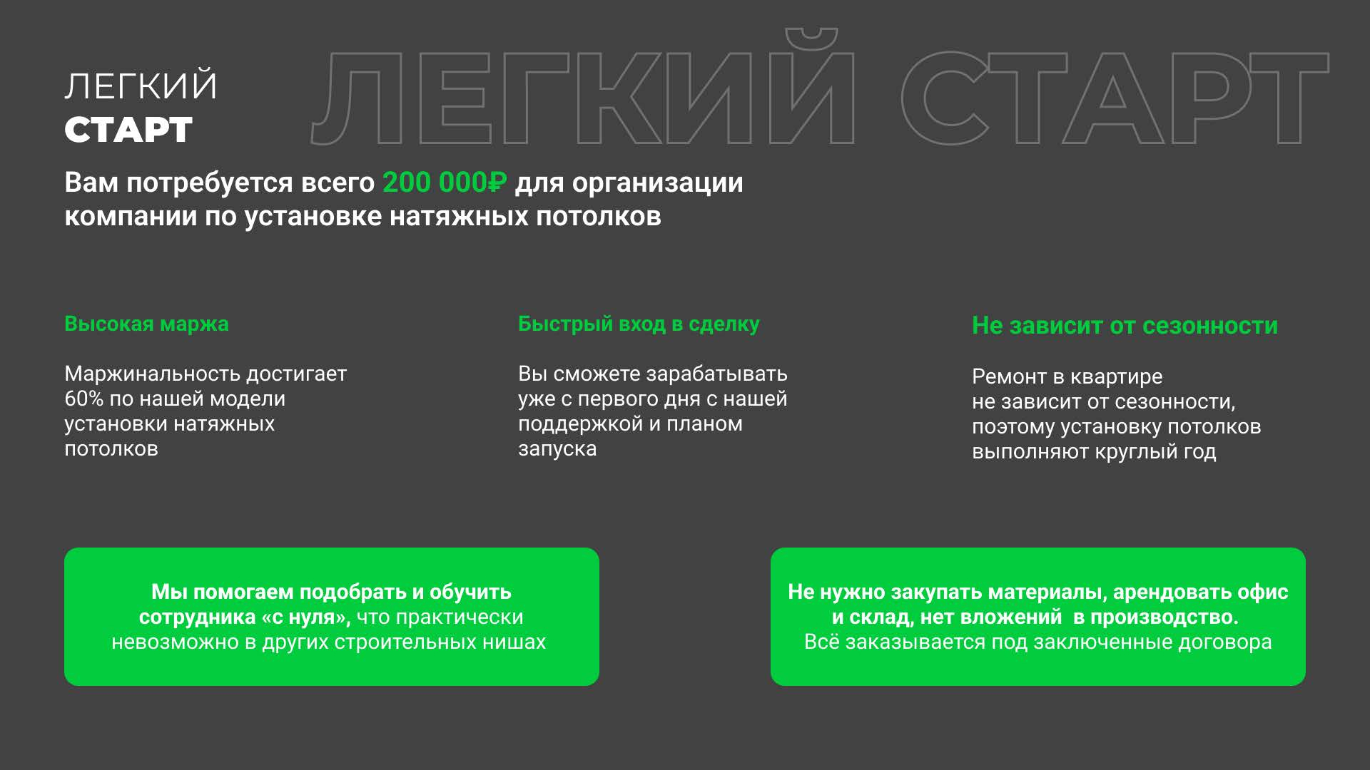 KIGERСтоимость500 000 ₽Инвестиции100 000 ₽Окупаемость2 мес.Доход700 000 ₽Запустив бизнес, вы будете зарабатывать до 700 000 рублей ежемесячно с маржой до 40%, устанавливая натяжные потолки. Гарантия прибыли прописана в договоре, а полное обучение и поддержка обеспечивают старт даже новичкам. В условиях роста строительного рынка наша специализированная ниша характеризуется высоким спросом и низкой конкуренцией, что создает благоприятные условия для вашего профессионального развития и финансового успеха