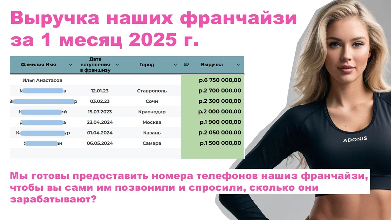 AdonisИстория успехаИван ЗыряновНовосибирскВ 3 месяц заработал 350 000 рублей чистой прибыли с франшизой Adonis-