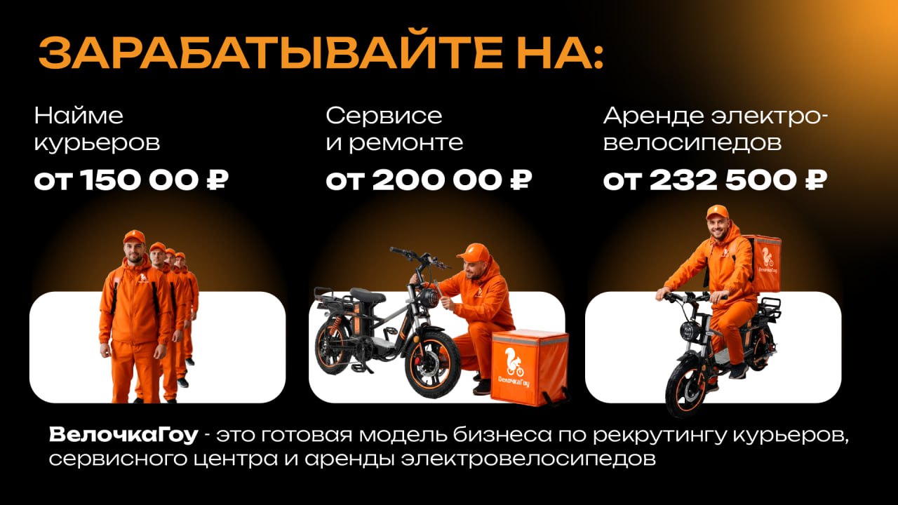 ВелочкаГоуСтоимость410 000 ₽Инвестиции80 000 ₽Окупаемость5 мес.Доход450 000 ₽Франшиза «ВелочкаГоу» — уникальный проект, объединяющий 3 направления: сервис электротранспорта, рекрутинг курьеров для служб доставки и аренду электровелосипедов для курьеров. Средняя чистая прибыль после выхода на плановые показатели может достигать до 700 000 руб. в месяц. Для новых партнёров предлагается велопарк из 15 электровелосипедов всего за 890 000 руб..