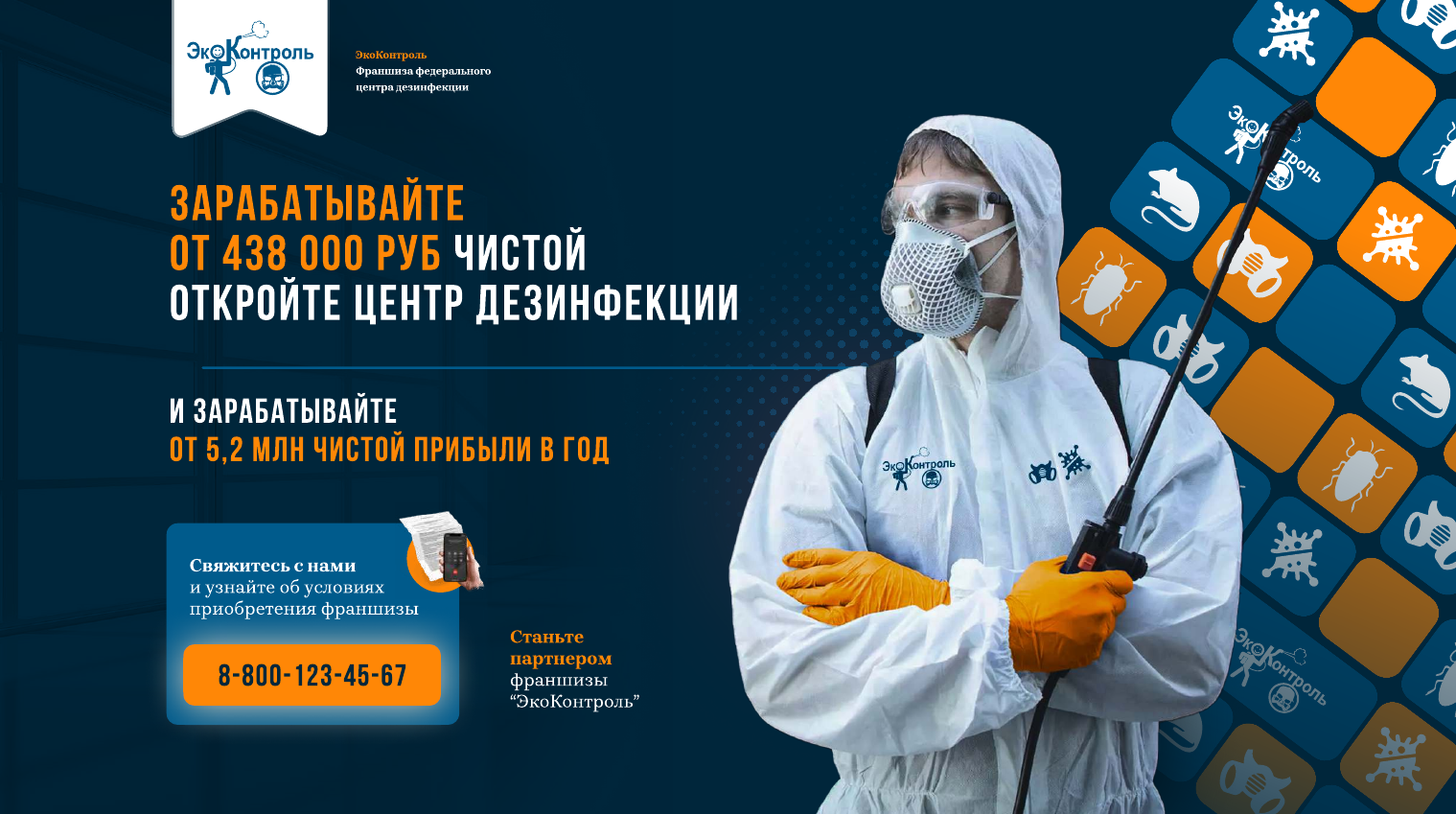 ЭкоконтрольСтоимость590 000 ₽Инвестиции500 000 ₽Окупаемость6 мес.Доход400 000 ₽Франшиза центра дезинфекции с доходом от 438 000 рублей и окупаемостью 6 месяцев. Экоконтроль — это сильный, известный бренд на рынке с 2011 года, два филиала в Москве и СПб. Работаем с субподрядчиками в 40+ городах, впоследствии этих клиентов передаем нашим франчайзи-партнерам. Количество обращений выросло до 150% за прошлый год. Мы участвуем в госконтрактах и регулярно выигрываем тендеры с высокой маржинальностью. Вы получаете готовую модель, бренд, обучение, сопровождение и клиентскую базу.