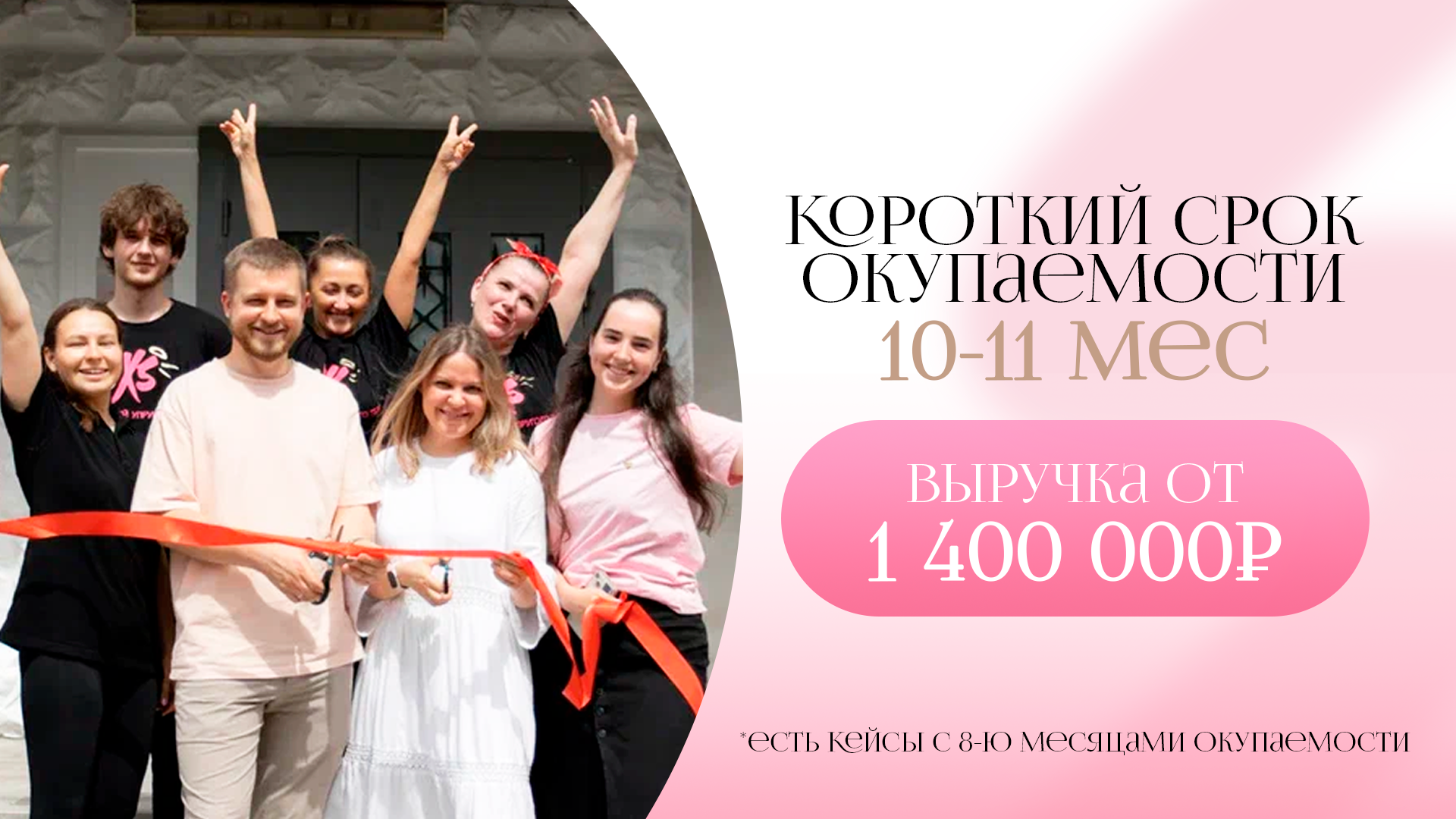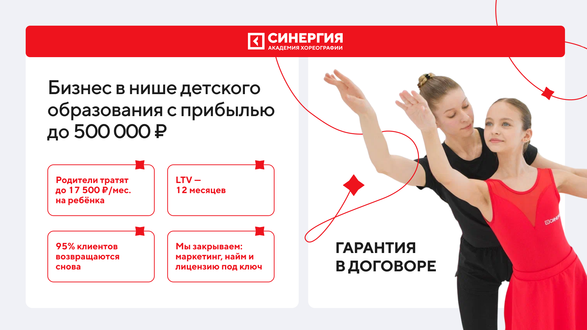 Франшиза детского доп. образования "Синергия"Стоимость400 000 ₽Инвестиции1 300 000 ₽Окупаемость9 мес.Доход2 000 000 ₽Рынок детского дополнительного образования растёт на 16% в год, и франшиза «Синергия» помогает занять в нём сильную позицию. Мы полностью берём на себя маркетинг, подбор персонала и лицензирование, а вы управляете школой. При среднем чеке 10 500 руб. и LTV ученика 9–12 месяцев партнёры выходят на доход до 1 500 000 руб. в месяц. Откройте школу танцев под известным брендом и начните зарабатывать с первого месяца.