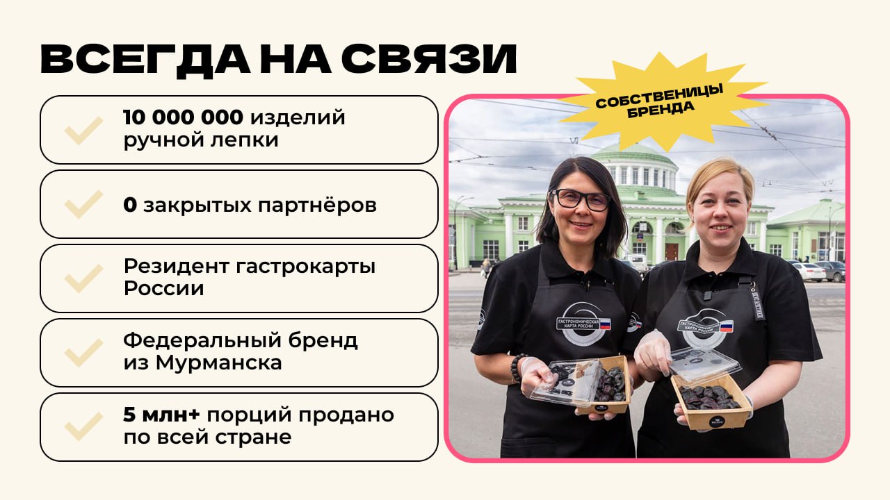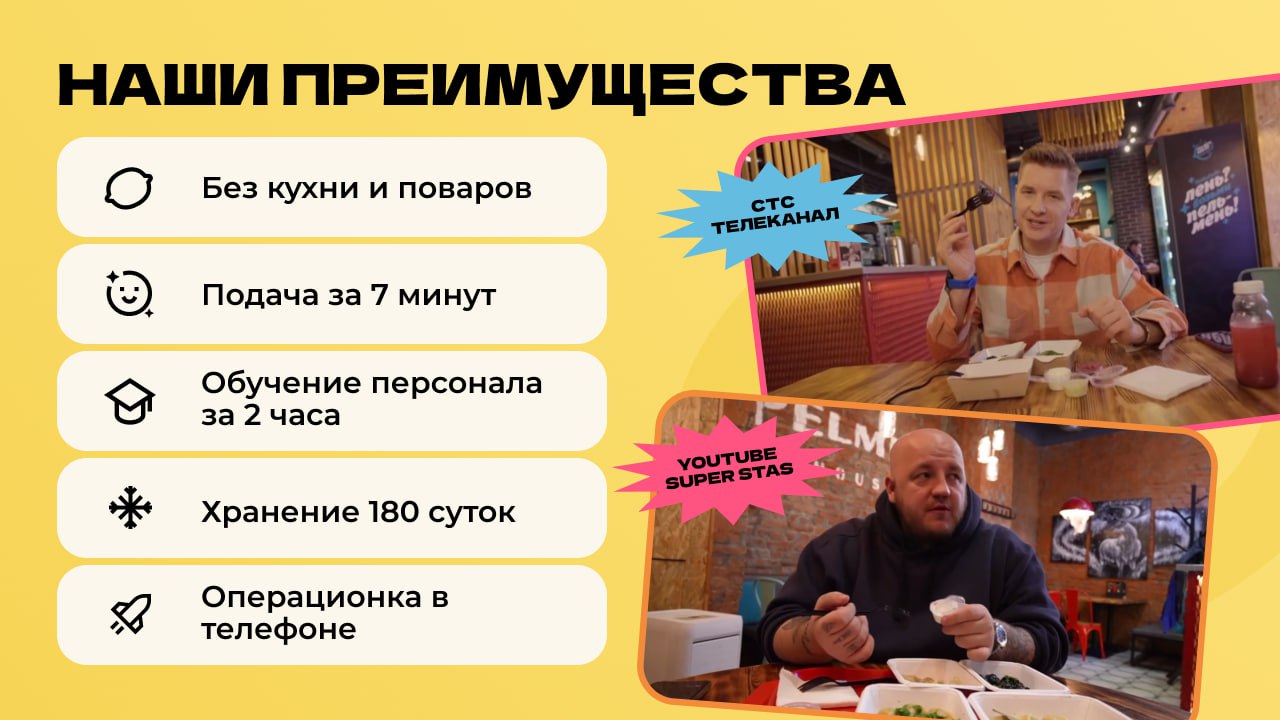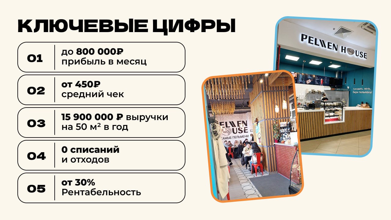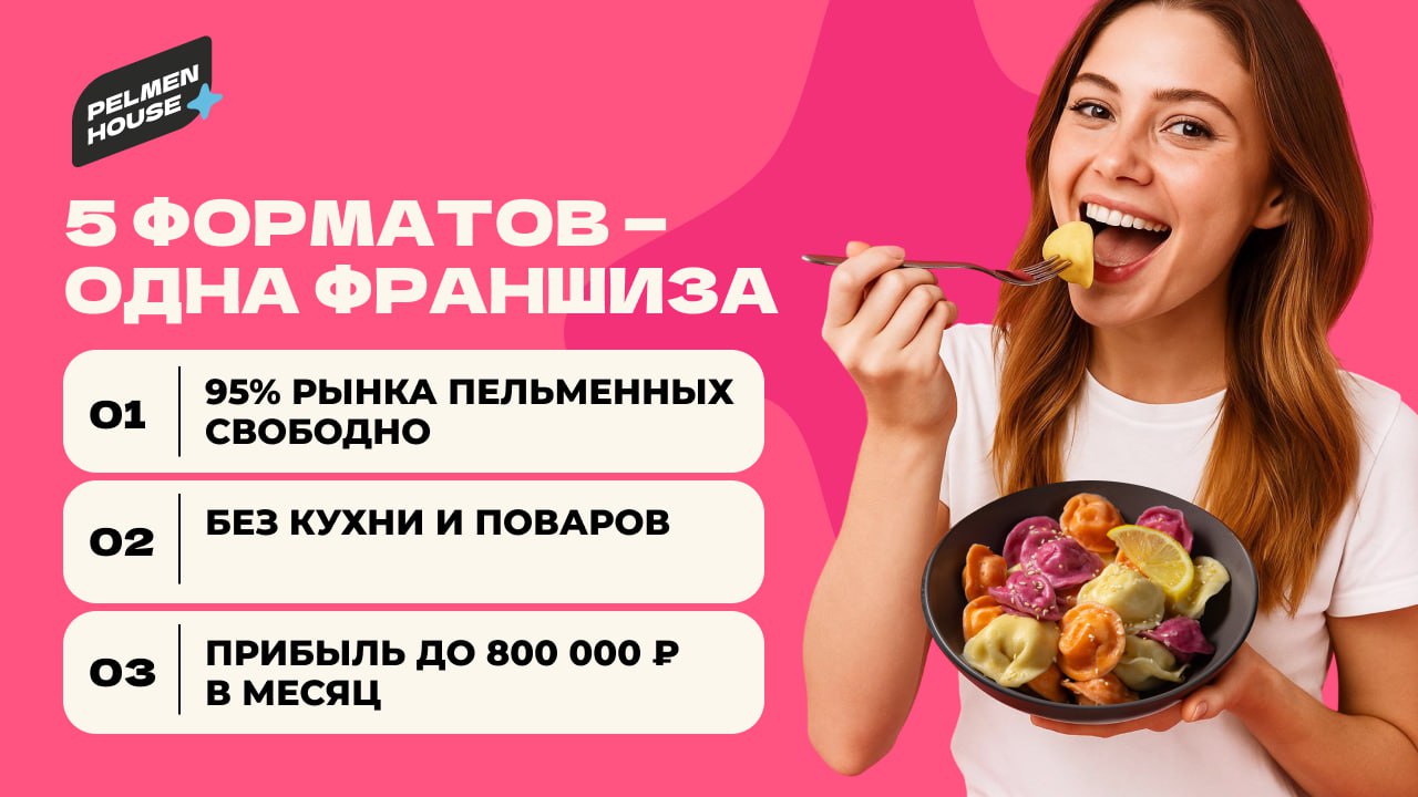 Pelmen houseСтоимость590 000 ₽Инвестиции800 000 ₽Окупаемость8 мес.Доход1 800 000 ₽95% рынка пельменных в России свободны. Pelmen House — франшиза №1: запуск за 4 недели, прибыль до 800 000 ₽ в месяц. Российский стрит-фуд: тонкое тесто, мясо, ручная лепка, авторские начинки. Без поваров, без кухни — 90% меню заморозка, хранится 180 суток, подача за 7 минут. Обучение персонала 2 часа. Pelmen House — победитель Гастрокарты России 2 года подряд. 5 форматов — киоск, фудтрак, фудкорт, кафе или вендинг 24/7. Пельмени в ТОП-3 блюд страны, а пельменных практически нет. Забирай свой город первым!