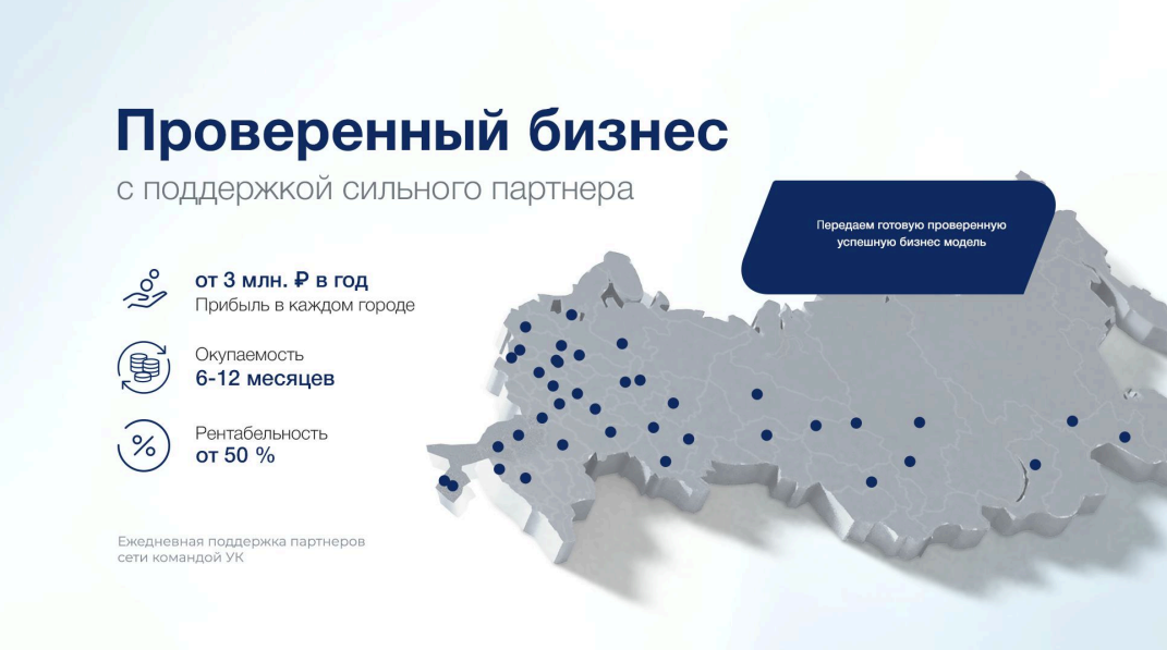 МяуЛайСтоимость300 000 ₽Инвестиции1 000 000 ₽Окупаемость7 мес.Доход300 000 ₽Станьте частью истории МяуЛай и зарабатывайте от 300 000 рублей ежемесячно на ветеринарных услугах! Нашим партнерам мы поможем запустить бизнес за 30 дней, проведем обучение для всей команды, поможем с поиском помещения, обеспечим клиентами, благодаря грамотно построенной рекламной кампании и дадим поставщиков оборудования. Наши клиники предоставляют лечение, стационар, гостиницу для питомцев, груминг и другие услуги. Готовая бизнес-модель и профессиональная поддержка позволяют партнёрам быстро выйти на стабильную прибыль.