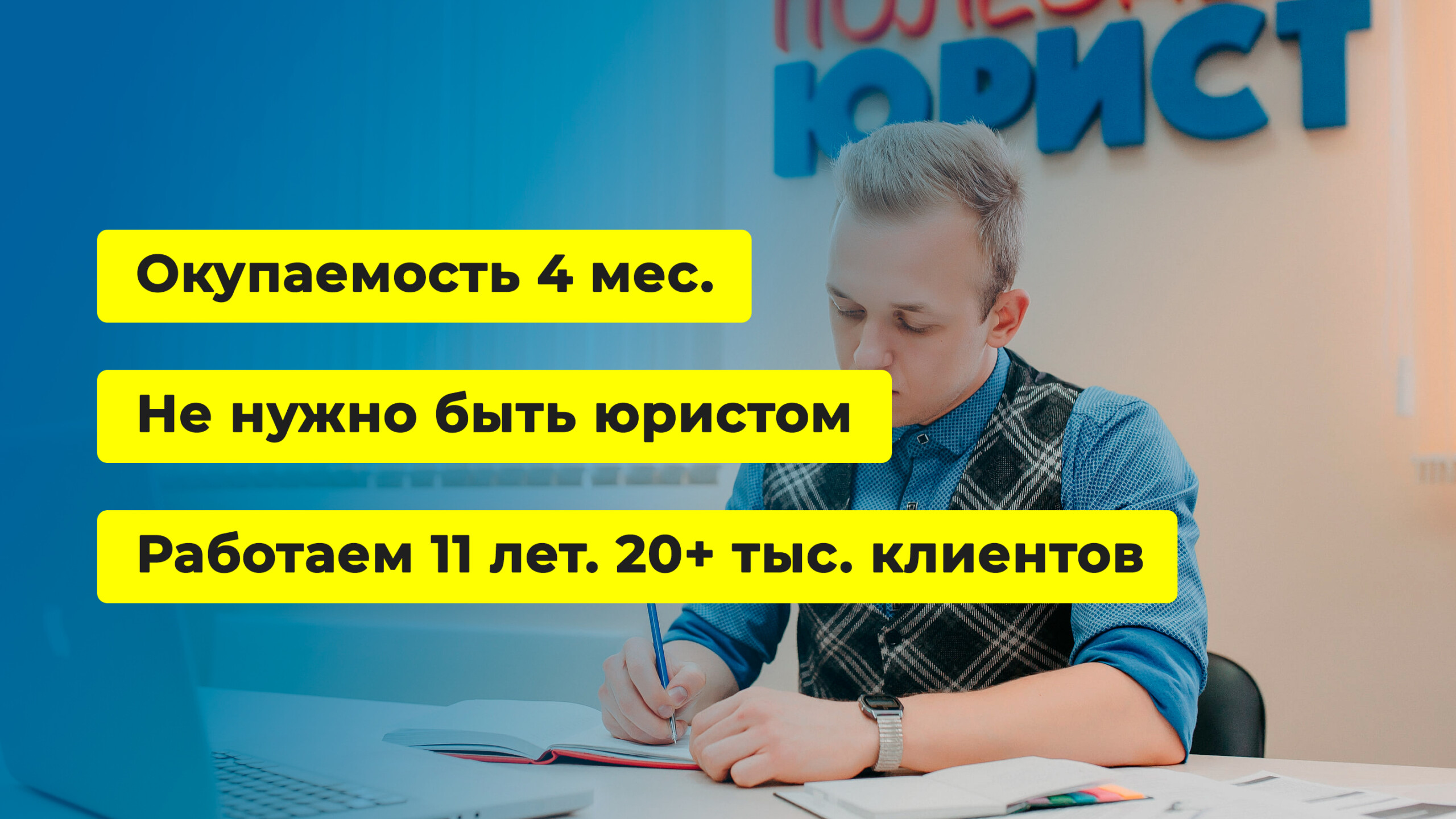 Полезный ЮристСтоимость390 000 ₽Инвестиции300 000 ₽Окупаемость4 мес.Доход400 000 ₽Откройте юридическую компанию по банкротству физ. лиц с чистой прибыль 400 000 рублей. С нами сейчас более 60 партнеров по всей РФ. 65 сотрудников управляющей компании возьмут на себя всю юридическую работу и ведение клиентов. Не нужно быть юристом. Компания Полезный Юрист работает 11 лет и помогла более 20 000 клиентам. Оставь заявку и получи подробный расчет прибыли и вложений для своего города!