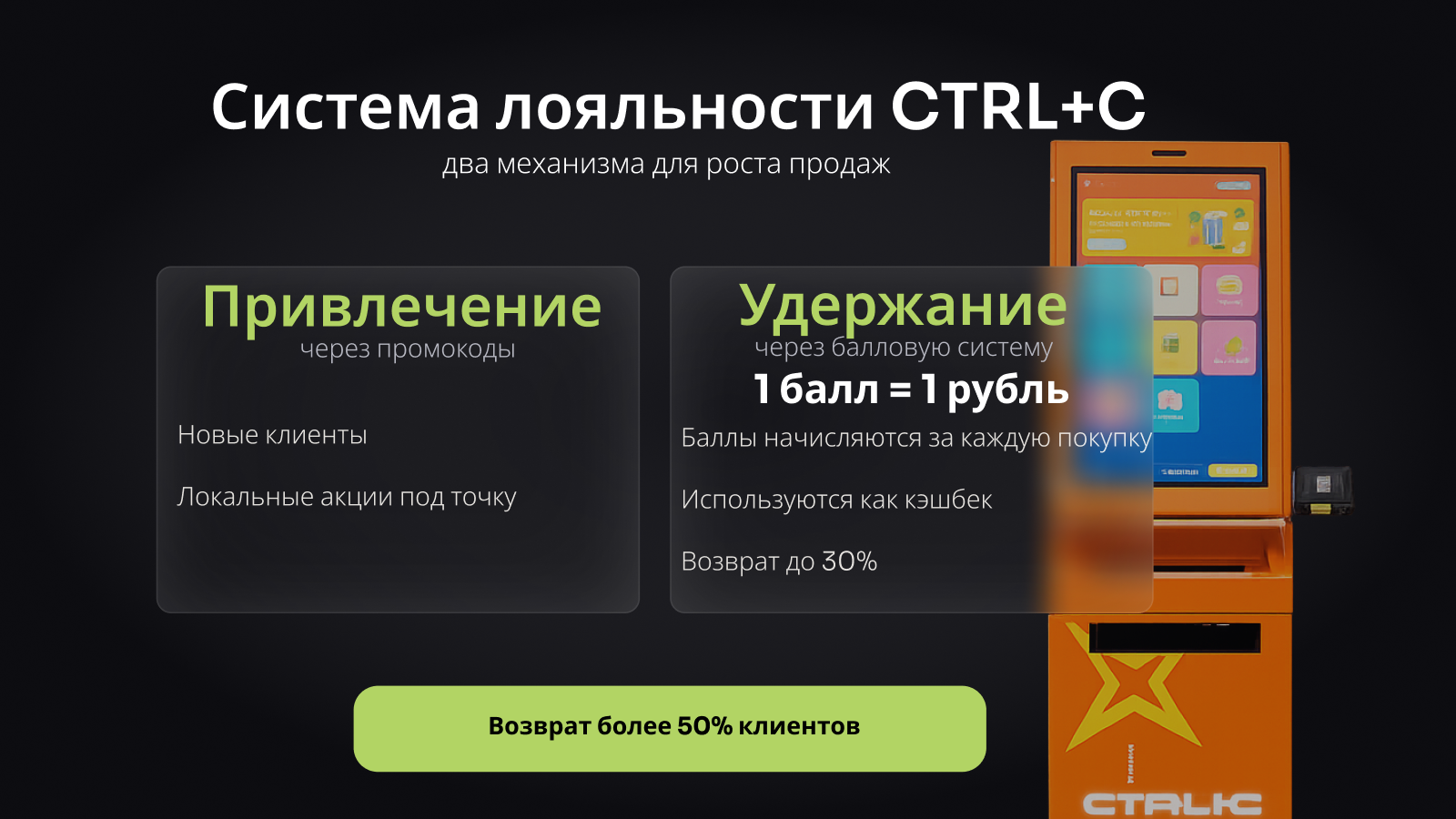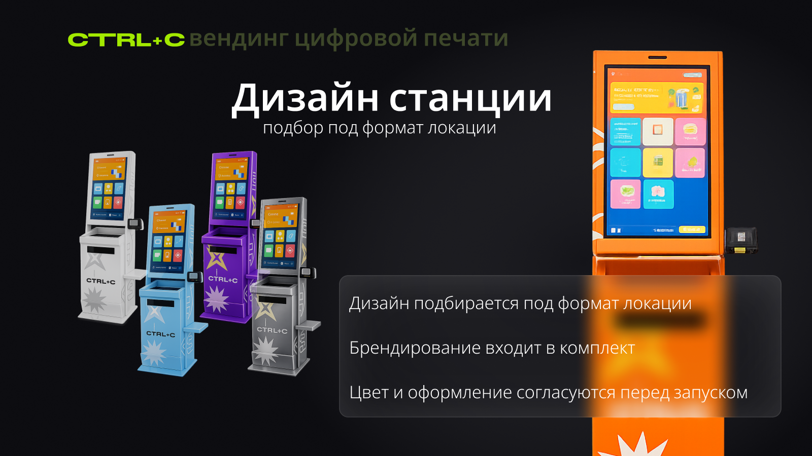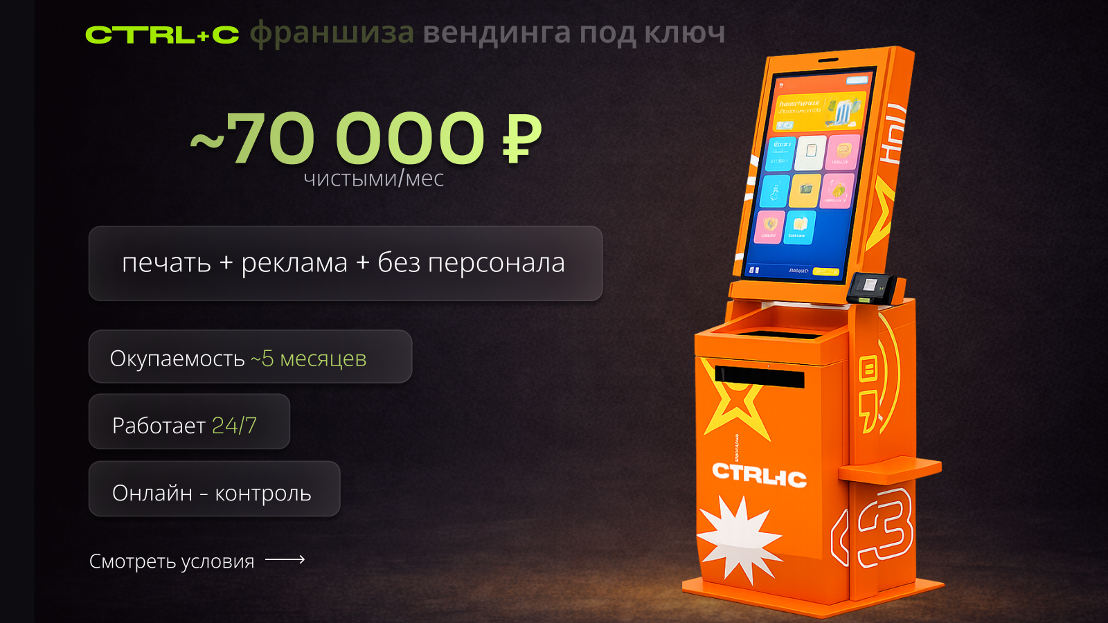 CTRL + CСтоимость180 000 ₽Инвестиции170 000 ₽Окупаемость5 мес.Доход70 000 ₽CTRL+C — вендинг цифровой печати и копирования 24/7 с двумя видами дохода. Получай ежемесячную от 70 000 р в востребованном и быстрорастущем направлении. Стабильный бизнес без сотрудников и отдельного помещения: клиент сам загружает файл, оплачивает и сразу получает распечатку. Два источника дохода: печать и реклама на станции от локальных бизнесов. От нас — обучение, запуск, техническое обслуживание станции и рекламные материалы. Подходит для старта и масштабирования в сеть из 2–3 точек.