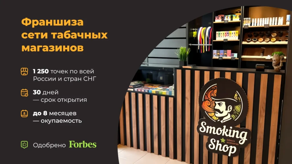 Открытие табачного магазина – это возможность войти в стабильный рынок. С 2015 года нами было открыто 1250+ магазинов по России и СНГ. Наши франчайзи получают до 300 000 рублей ежемесячной прибыли благодаря высокой наценке на товар – до 400%. Рынок табачных изделий, вне зависимости от ситуации на рынке, продолжает рост и, по данным аналитиков, к 2031 году увеличится на 15%. Мы обеспечиваем вас обучением, поставками и дизайном. Запустите магазин по проверенной модели и начните получать доход с первых месяцев работы!