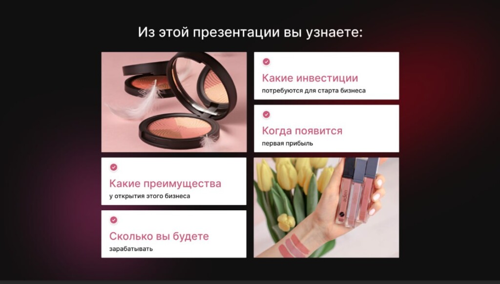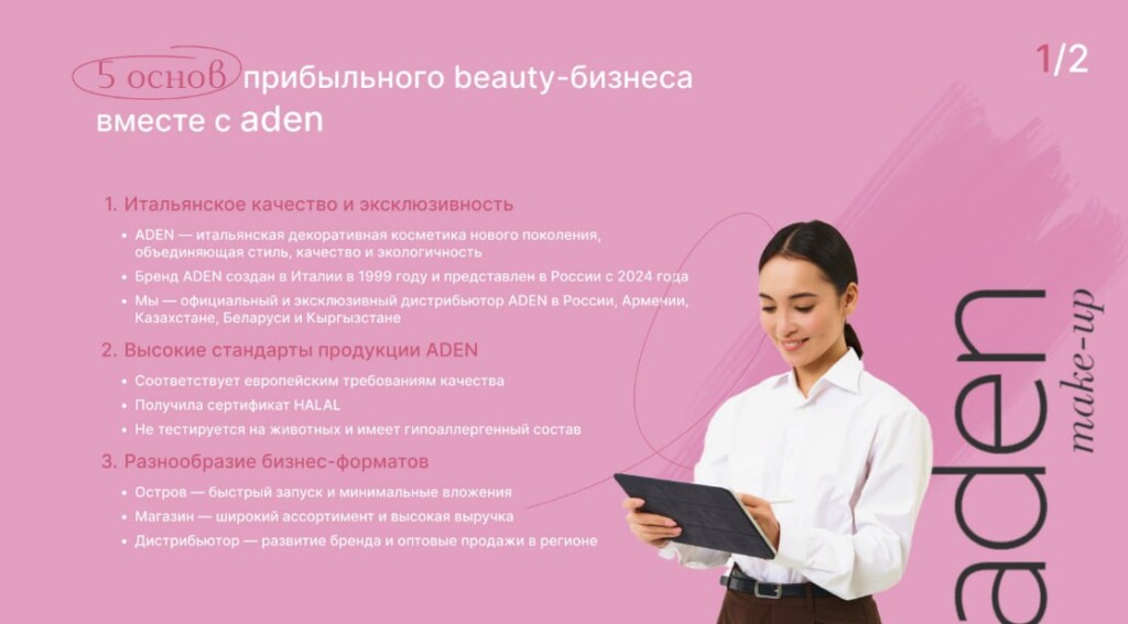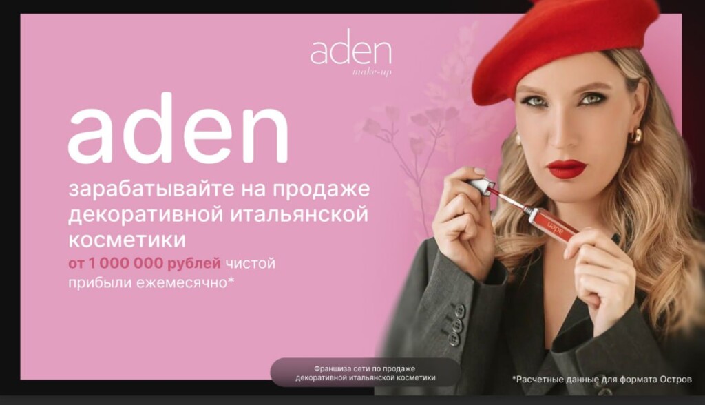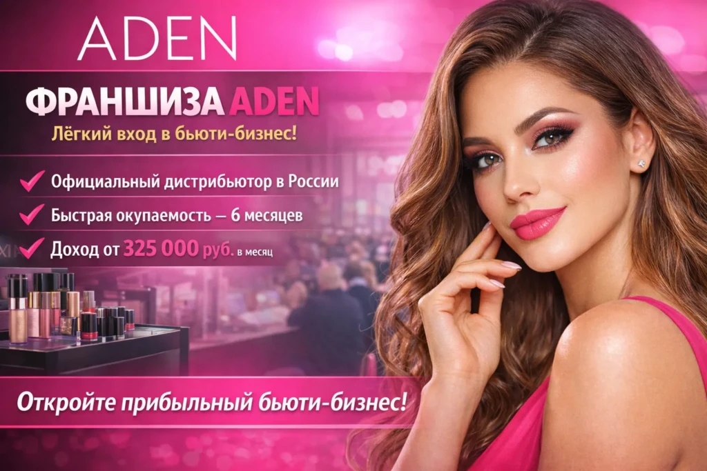 Франшиза ADEN — лёгкий вход в бьюти-бизнес с высокой маржой. Мы — официальный дистрибьютор итальянского бренда ADEN в России. Мы предлагаем эксклюзивные продукты с безупречной репутацией: соответствуют стандарту HALAL, веган-формуле, гипоаллергенны и не тестируются на животных. Наши партнёры зарабатывают от 325 000 рублей в месяц. Вы получаете федеральную рекламу, участие в выставках и конференциях, а также поддержку на всех этапах. Станьте нашим партнёром — откройте точку ADEN и подарите клиентам красоту, которой можно доверять.